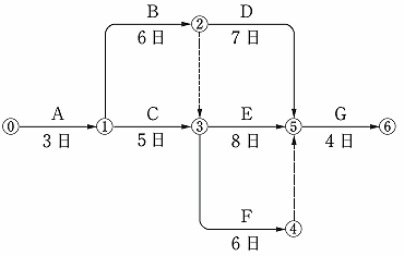 下図のネットワーク式工程表に示す工事のクリティカルパスとなる日数は、次のうちどれか。ただし、図中のイベント間のA〜G は作業内容、数字は作業日数を表わす。