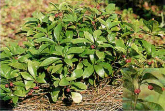 幹は1本立ちで地下茎を伸ばして増え、直立の枝が群生して地表を覆う。葉は互生、対生、輪生があり、4〜13cmの長楕円形で縁に細かい鋸歯がある。葉脇に自小花、小球形の赤い実が付く |