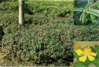 常緑または半落葉。株立状で枝端が少し下垂する。葉は対生し、4〜 8cmの長楕円形で質は薄く、全縁、先は丸い。4〜6cmの黄色の花を枝先に付け、黄色の長い雄しベが多数群がつて立つ |