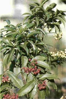 茎は直立し、茎の上部で側枝を四方に開く。葉は4〜 13cmの長楕円形で互生、ときに輸生する。革質で光沢をもち、縁は波状で葉先が尖つている。果実は約6mmほどの球形で赤熟する |