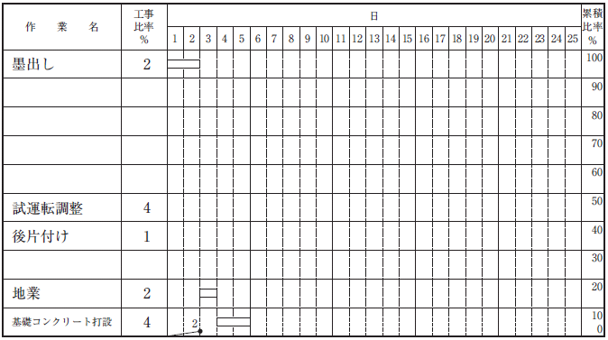 横線式工程表(バーチャート工程表)の作業名欄に、作業名を作業順に並べ替えて記入しなさい。 |