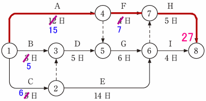 | 〔設問2〕 | 工事着手後7日目に進行状況をチェックしたところ、作業Aは3日、作業Bは2日、作業Cは1日遅れていた。また、作業Fは更に3日必要なことが判明した。その他の作業の所要日数に変更はないものとして、当初の工期より工期は何日延長になるか示しなさい。 | |||||||||