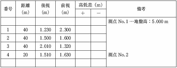 測点No.2の地盤高を求めるため、測点No.1を出発点として水準測量を行い下表の結果を得た。No.2の地盤高は次のうちどれか。